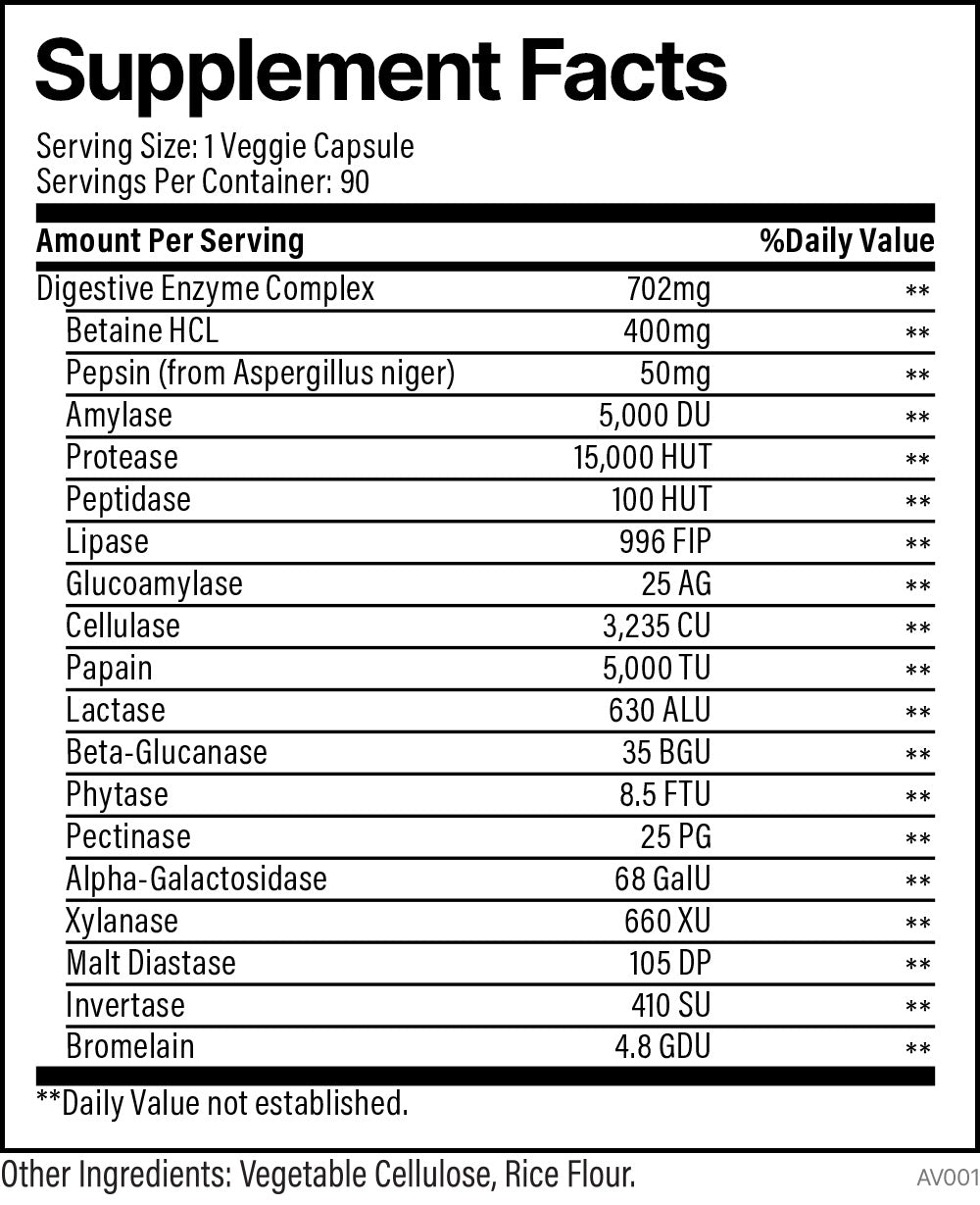Introducing Digestive Enzyme Complex by Elemental Health Sciences; a meticulously crafted formula designed to support your digestion and optimize nutrient absorption. The intricate process of digestion requires the indispensable production of digestive enzymes within our bodies. These enzymes play a crucial role in breaking down ingested food into its smallest, easily absorbable components. They skillfully deconstruct proteins, carbohydrates, and fats into their elemental building blocks — amino acids, sugars, and fatty acids. However, factors such as age, diet, and occasional stress, can deplete enzyme levels, leading to digestive discomfort, bloating, and nutrient deficiencies. This is where supplementation can step in to bridge the gap and support optimal digestion.