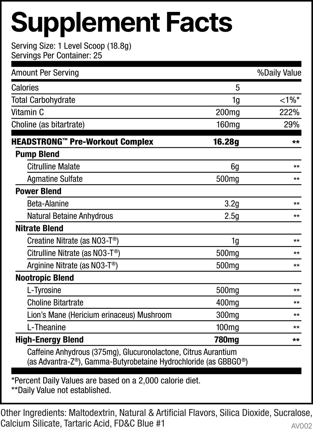 Headstrong's cutting-edge combination of powerhouse ingredients has everything you crave from a pre-workout supplement: pump, power, focus, and of course, energy for days! Your workouts will never be the same! Think you can handle it? Don’t think! Just do. Pick up a bottle of Headstrong today and get ready to have your mind blown and your body wrecked like never before during your next workout session.