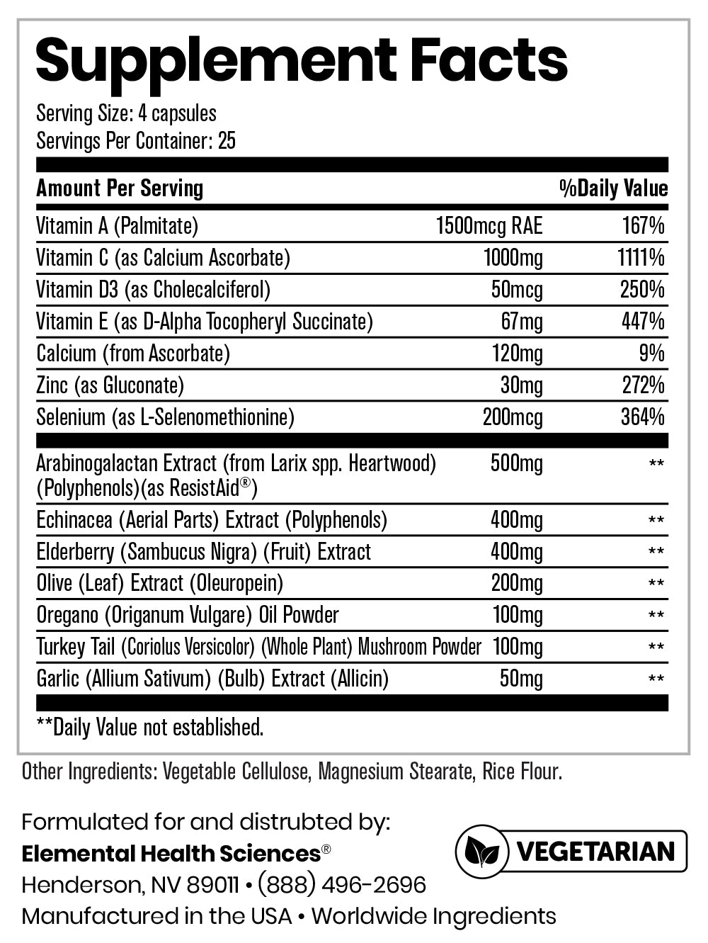 The health-conscious formulators at Elemental Health Sciences® made it their mission to scour the globe for the absolute best ingredients to craft together for a fully transparent and fully loaded immune-support formula. These ingredients include potent herbals and botanicals known for their immune-support capabilities, like Echinacea, Elderberry, Olive Leaf Extract, Oregano Oil Powder and Garlic, along with must-have minerals like Zinc and Selenium.