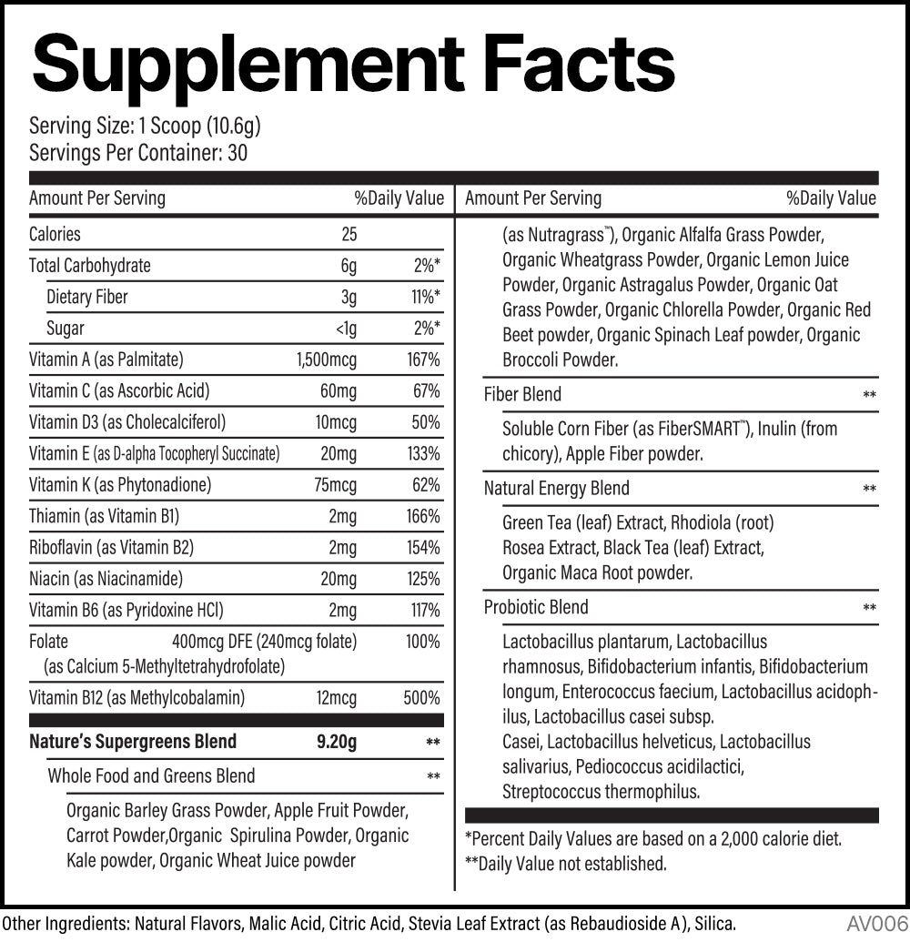 Nature's Supergreens offers all the healthy goodness of superfoods and greens from around the world in a delicious-tasting powder that you can mix with juice, water or a protein shake. It’s convenient, it gives you a great dose of vital nutrients and it even boasts a natural energy blend, a probiotic blend, and fiber blend. Make your health and vitality a priority with Nature's Supergreens!