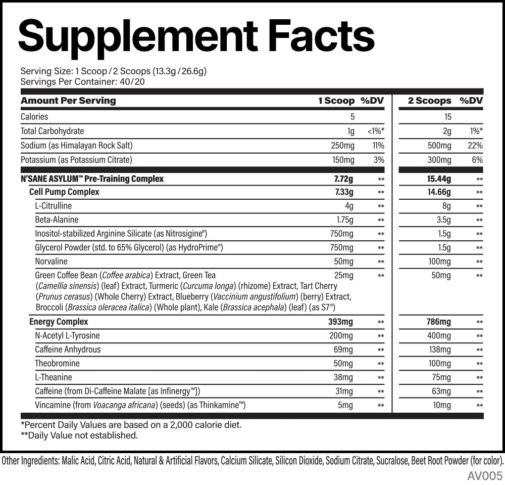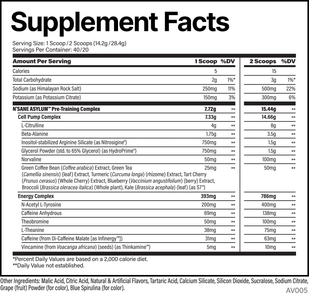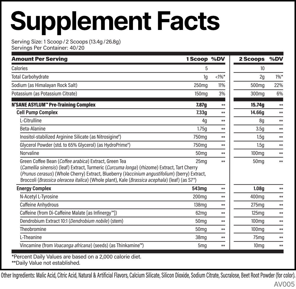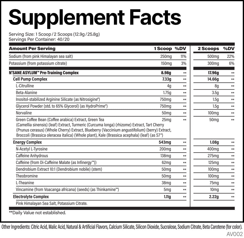 N'SANE Asylum stands as a pinnacle of performance enhancement, surpassing conventional pre-workout supplements. With a commitment to excellence, this innovative formula features popular components such as 8 grams of citrulline malate and 3.5 grams of beta-alanine. However, what truly sets N'SANE Asylum apart is its dynamic roster of trademarked ingredients, including Nitrosigine®, S7®, HydroPrime®, Infinergy™, and Thinkamine™.