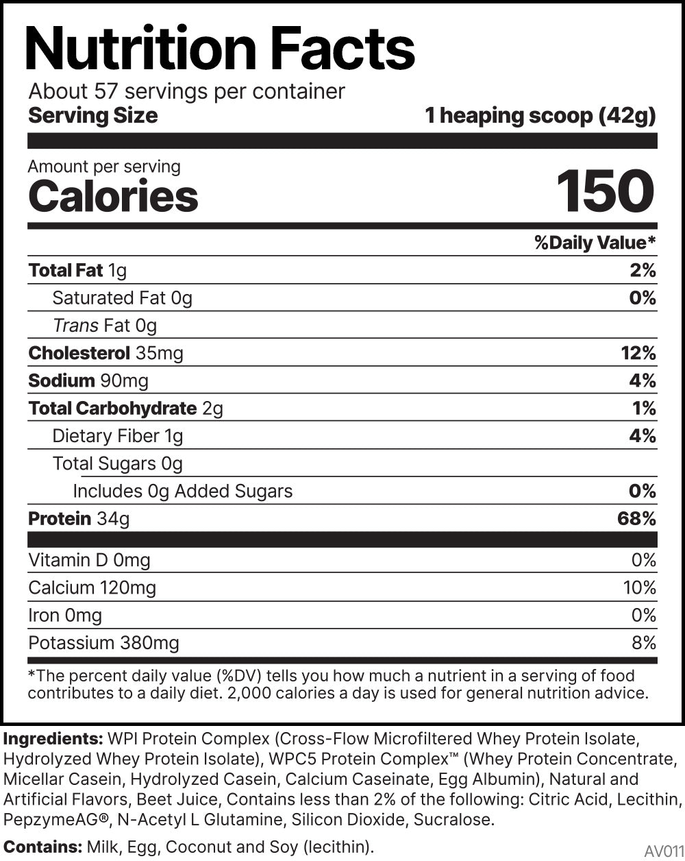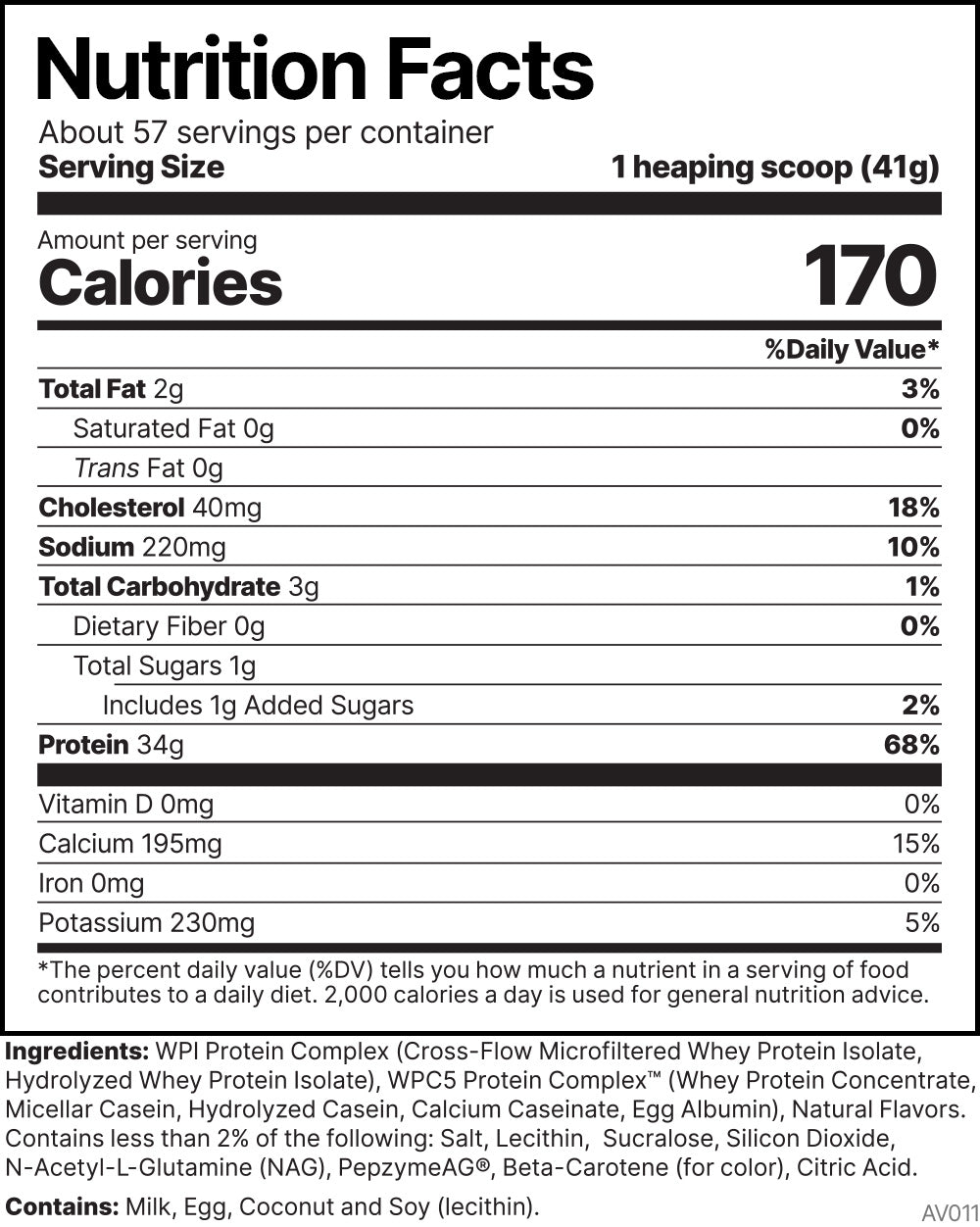 This elite protein powder features a unique blend of 7 forms of protein, including WPI Protein Complex (Cross-Flow Microfiltered Whey Protein Isolate and Hydrolyzed Whey Protein Isolate) and WPC5 Protein Complex™ (Whey Protein Concentrate, Hydrolyzed Casein, Potassium Caseinate, Micellar Casein, and Egg Albumin).
