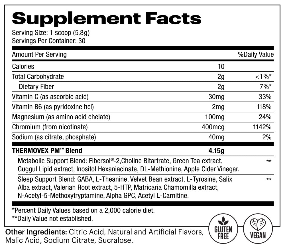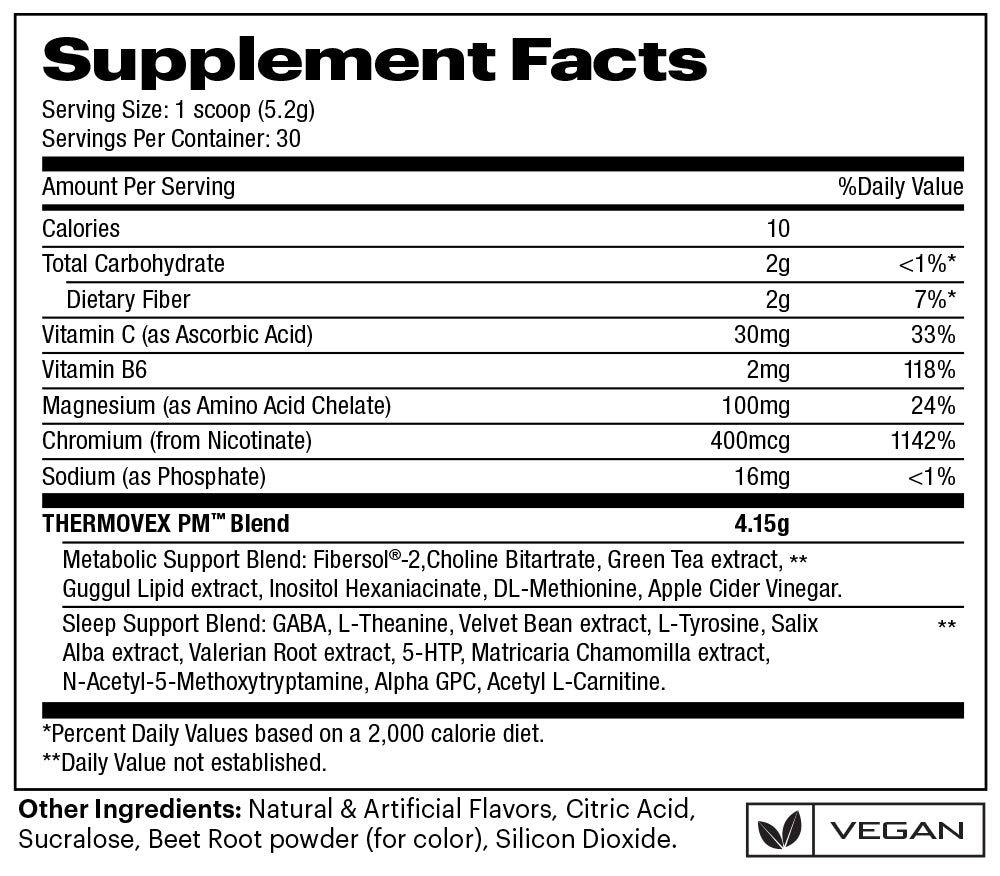 That’s why choosing the right supplement before bed is so critical. THERMOVEX PM™ is a sugar-free, nighttime metabolic formula that addresses this common issue. Formulated with popular ingredients used by many fitness-minded individuals before calling it a night, THERMOVEX PM™ has quickly become a go-to supplement used regularly by loyal customers. Don’t waste another day of clean eating and a great workout to lack of sleep!